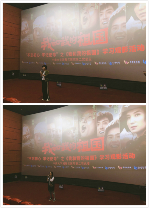 为庆祝中华人民共和国成立70周年,践行初心使命,弘扬新时代爱国主义精神。10月24日晚,在中南大学湘雅三医院党委委员、总会计师汤英的组织下,第二党总支书记苏莉领下,湘雅三医院第二党总支组织百余名医务人员集体观看了新中国成立70周年献礼片《我和我的祖国》。