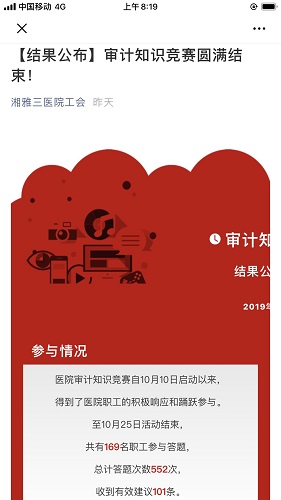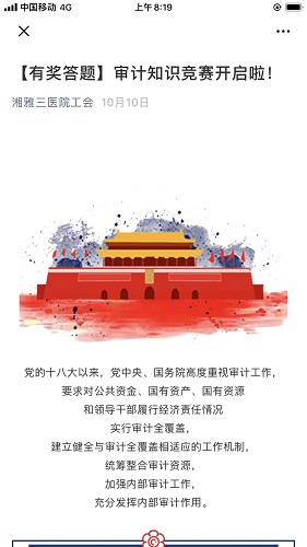 近日,湘雅三医院审计办公室联合院工会共同组织了一场为期两周的面向全院职工的审计知识竞赛线上有奖答题活动。本次答题活动旨在全院普及内部审计相关知识,激发全院职工学习内部审计法规、规章制度的热情并最终达到职工了解、支持审计工作的目的。活动采用赛中学、学中赛的方式,竞赛的内容涵盖了《中华人民共和国审计法》、《审计署关于内部审计工作的规定》及医院近期发布的三个内部审计规章制度。