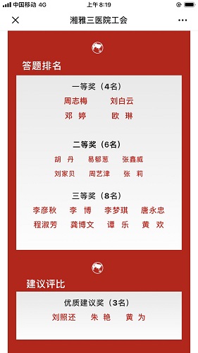 本次答题活动自10月11日正式启动,得到了医院职工的积极响应和踊跃参与。至10月25日活动结束,共有169名职工参与答题,总计答题次数552次,收到有效建议101条。根据竞赛评分规则,评出了一等奖4名,二等奖6名,三等奖8名,优质建议奖3名。(具体获奖名单已在医院工会微信公众号上公布)