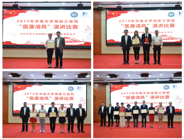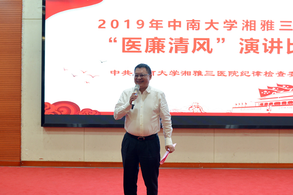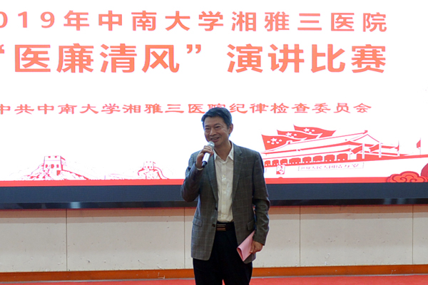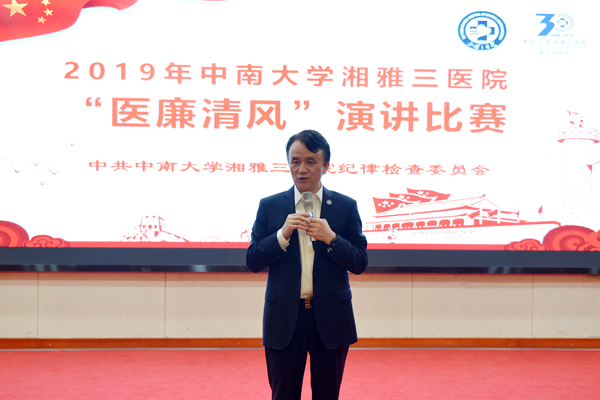 张劲强表示,本次演讲比赛紧密结合“不忘初心、牢记使命”主题教育和中南大学湘雅三医院党风廉政宣传教育月活动,引导全院党员职工牢记行医初心,担当健康中国使命,讲品德比境界、讲纪律比担当、讲作为比奉献,在全院上下营造浓厚的学廉、崇廉、倡廉、守廉的氛围,向建院三十周年献礼。