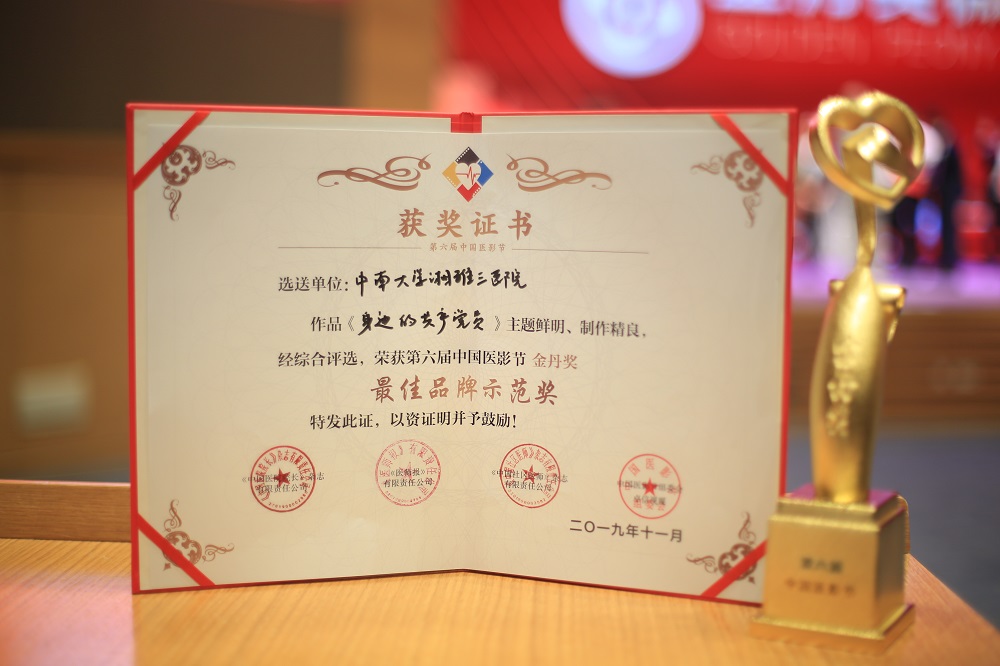 2019年11月16日,第六届中国医影节“金丹奖”微电影颁奖盛典在厦门国际会议中心盛大举行,来自全国一百余家单位的“医小影”代表们在现场见证了各类奖项的归属。中南大学湘雅三医院选送影片《身边的共产党员》荣获金丹奖——最佳品牌示范奖。
