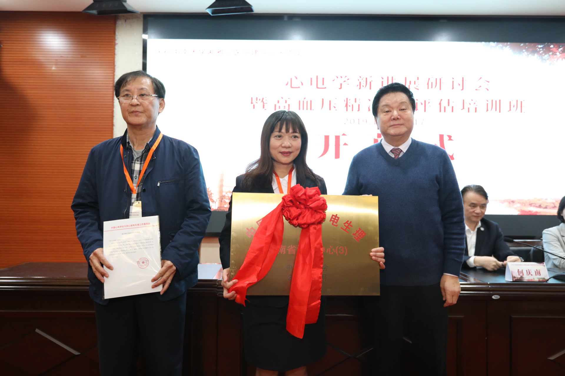 中国心电学会无创电生理专业工作委员会主任委员、浙江省人民医院李忠杰教授宣读中国心电学会批文,中国心电学学会主任委员、北京大学人民医院郭继鸿教授进行授牌。