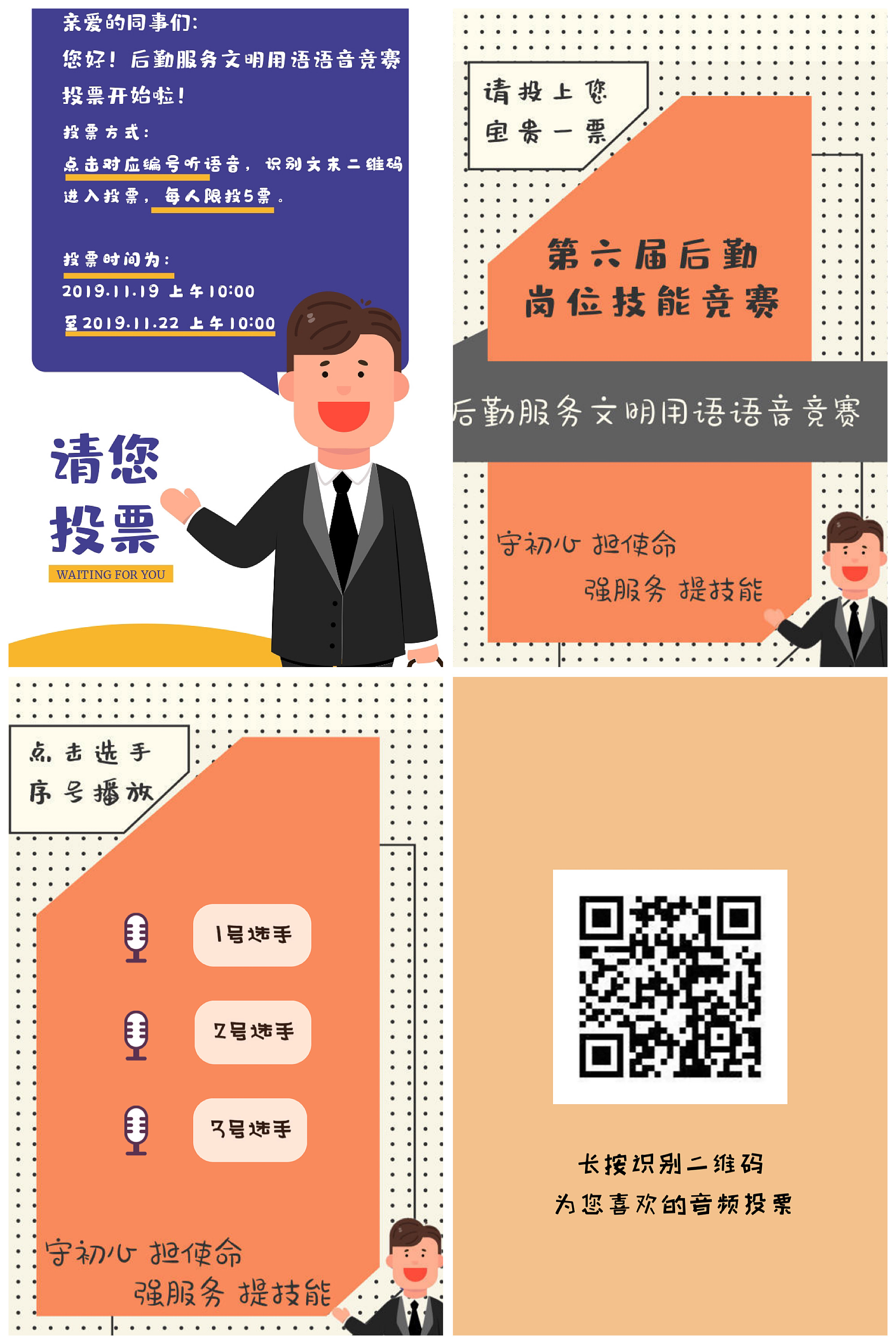 近日,在第十党总支和第十分工会的大力支持和指导下,医院财务部突破固有方式,创新比赛机制,以线上比拼、不记名盲投方式举办 “后勤服务文明用语语音竞赛”。来自后勤各部门的20余名职工参加本次竞赛。竞赛指定普遍使用的文明用语,由各参赛选手用普通话读出,将音频在全院范围内进行在线不记名的盲投。投票通道开启时间为2019年11月19日上午10点,为期3天。