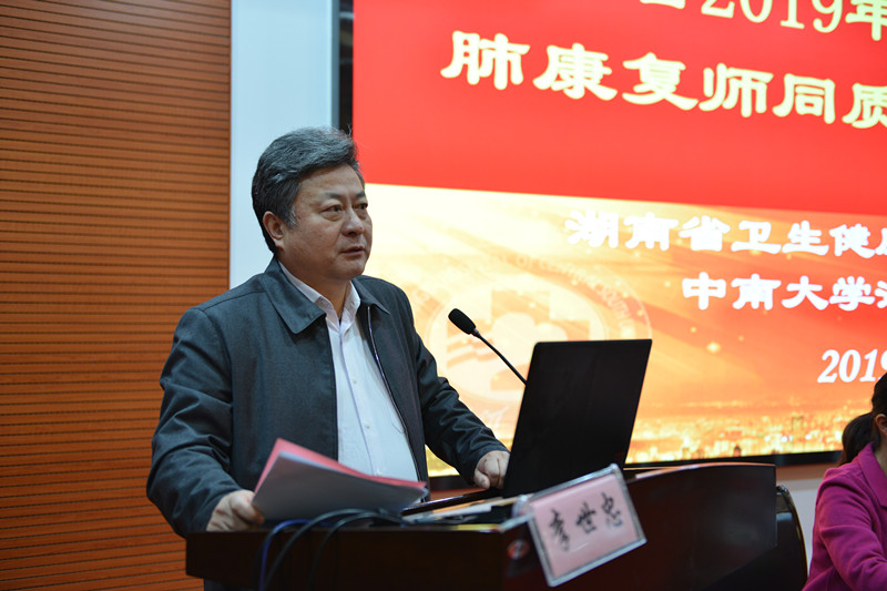 11月30日,由湖南省卫生健康委医政医管处主办,中南大学湘雅三医院承办的2019年湖南省县级综合医院肺康复师同质化培训班总结大会在湘雅三医院外科楼学术报告厅举行,省卫健委医政医管处副处长李世忠、主任欧阳煜出席,湘雅三医院护理部主任严谨、呼吸与危重症医学科主任孙圣华、营养科主任刘敏、康复科副主任严文广、护理教研室副主任易琦峰、湘雅三医院肺康复项目指导老师、湖南省48 所贫困县县级医院呼吸与危重症医学科主任和肺康复师等参加。会议由欧阳煜主持。