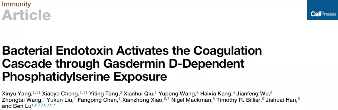 12月10日,中南大学湘雅三医院血液内科吕奔教授团队以“Bacterial Endotoxin Activates the Coagulation Cascade through Gasdermin D-Dependent Phosphatidylserine Exposure”为题在Immunity上发表了最新研究成果,阐述了Caspase-11及其酶切底物—Gasdermin D(GSDMD)在细菌感染诱发DIC过程中发挥的关键作用,揭示了革兰氏阴性细菌诱发DIC的分子机制。