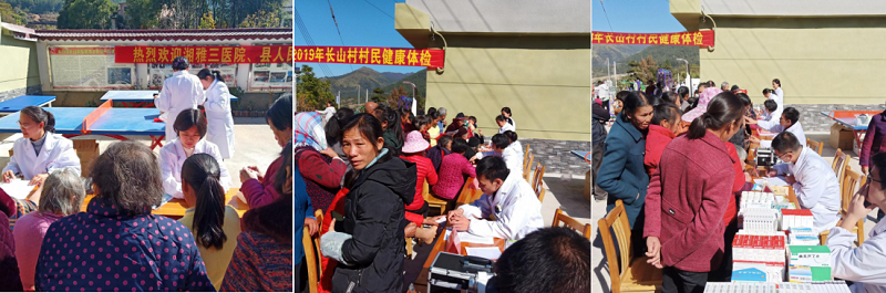 过去由于长山村地处山区,交通不便,经济落后,不少村民身患高血压、糖尿病、冠心病、肿瘤,村卫生室医疗资源匮乏,村民患病得不到及时救治。中南大学响应党中央号召,对江华县长山村进行了精准扶贫,捐建了中南大学长山健康小屋,村医务室装修一新,硬件条件得到明显改善,配备了胸片、B超等设备。得知湘雅三医院专家来村里义诊,很多患者早早来到村医务室等候,医务室前坪挤满了人,村民们有秩序地等候专家义诊。