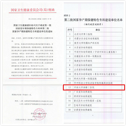 2019年10月12日,国家卫生健康委妇幼司下发了《关于开展第二批国家孕产期保健特色专科建设工作的通知》。在2019年的最后一天12月31日,医院收到了国家卫生健康委妇幼司传来的喜讯——中南大学湘雅三医院荣获“国家孕产期保健特色专科”称号。