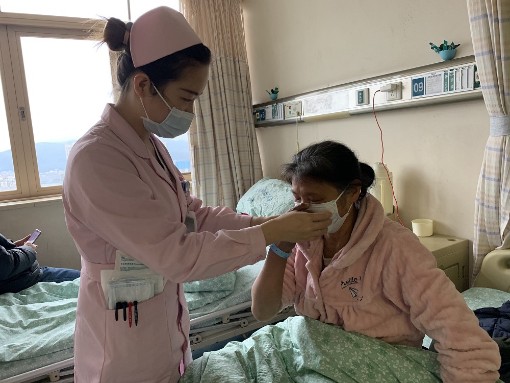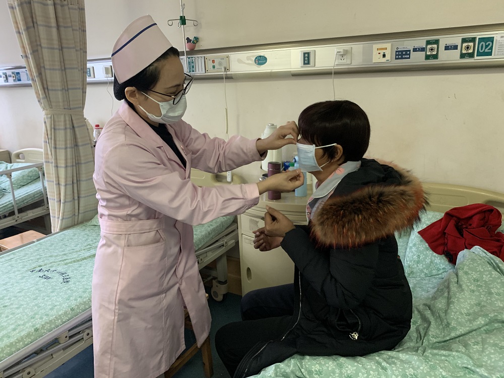 王玲护士长带领刘娟主管护师、杨玥晗护师给病人及陪人分发口罩,并告知口罩的正确佩戴方法:白色面朝内、蓝色面朝外。同时,橡皮筋挂上双耳后捏紧金属片和鼻子贴合,使口罩和面部之间尽量不留缝隙。
