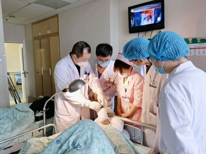 除夕,罗主任带队查房,认真仔细的查看每位患者。