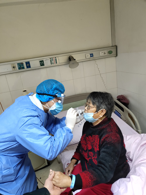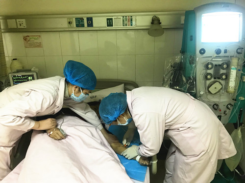 由于护理工作中,护理人员需要直接接触疑似患者,但在湘雅三医院肾脏内科,这里所有的护理人员都没有一位退缩。他们在每一间病房进行防护宣教工作,他们逐一告知患者及陪护家属正确佩戴口罩的方式。当疑似患者血管条件非常不好,需要进行床旁血滤治疗时,骆绍琴主管护师和周煌主管护师没有丝毫畏惧、共同协作,耐心寻找血管,尽最大可能一次性穿刺成功,有效减少患者的痛苦。