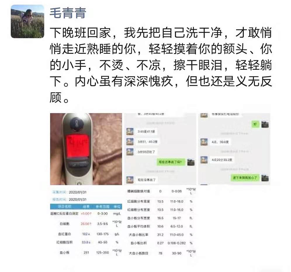 今年是护士毛青青来到儿科急诊的第十二个年头。新年的两个晚夜班,上班前家中一岁的孩子发着高烧,贴心的老公为了让她少一些后顾之忧,悉心照顾孩子,随时报告孩子的情况,即便如此她也只能闲暇之余回复一句:“还在寒战吗”?“注意体温”。“好,退下来我就放心了”。“下班回到家,先把自己洗干净才敢悄悄走近你,轻轻摸着你的额头、你的下小手,不烫、不凉、擦干眼泪。轻轻躺在你的身侧,虽然内心愧疚不已,但还是义无反顾。”看到她的文字让人无不动容,热泪盈眶,她是怀着满满一腔爱和责任的战士!