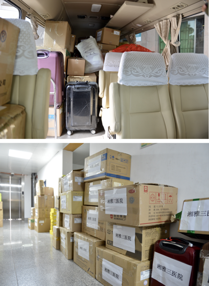 2月9日,在中南大学湘雅三医院援鄂国家医疗队大部队出发的第二天,彭伟莲、龙烁、黄辉三人,携50件物资紧随其后,驰援武汉。