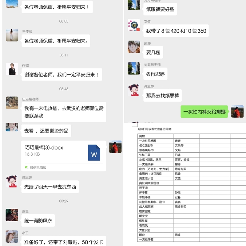 微信里是铺天盖地的信息。原本要上夜班,护士长立即改班告诉我取消夜班,整理所需物品,好好休息,为备战一线做充足准备,并叮嘱我一定要保护好自己。科室姐妹们已经开始给我紧罗密布地进行物资准备。直到凌晨科室群里还在你一言我一语的说着能提供什么,明天去帮我买什么,这一瞬间,我强烈的感受到了来自湘雅三医院这个大家庭的温暖。我反复告诉自己:我不是一个人在战斗,我也不是一个人去前线,我的身后有着一群爱我的和我爱的亲人和家人。那些来自科室老师、领导们的关怀,还有我那群亲爱的姐妹们,他们的帮助让我的武汉行信心倍增。当晚,我眼角挂着激动与感动的泪珠,安心的进入了梦乡……