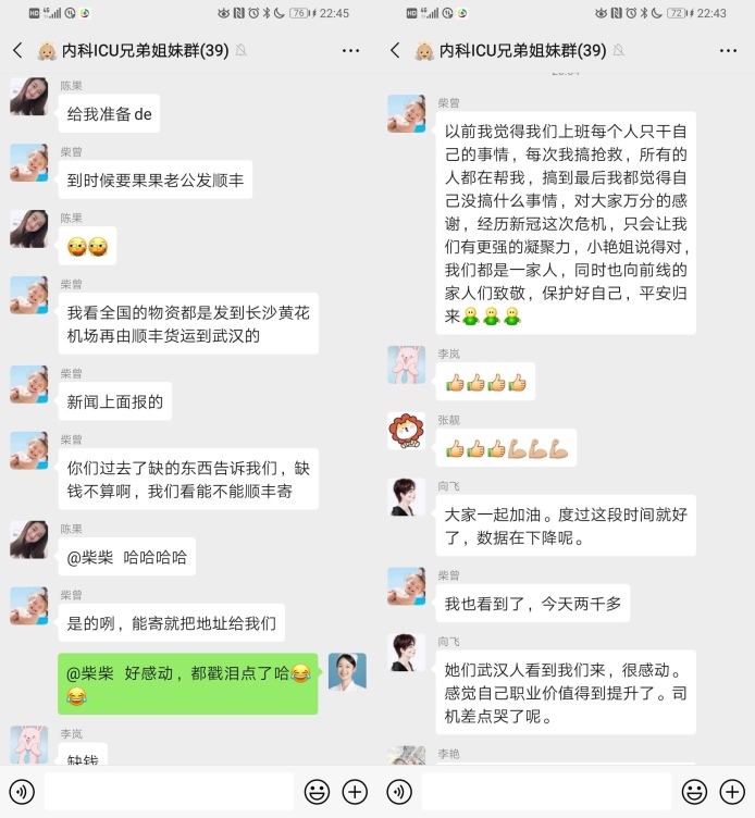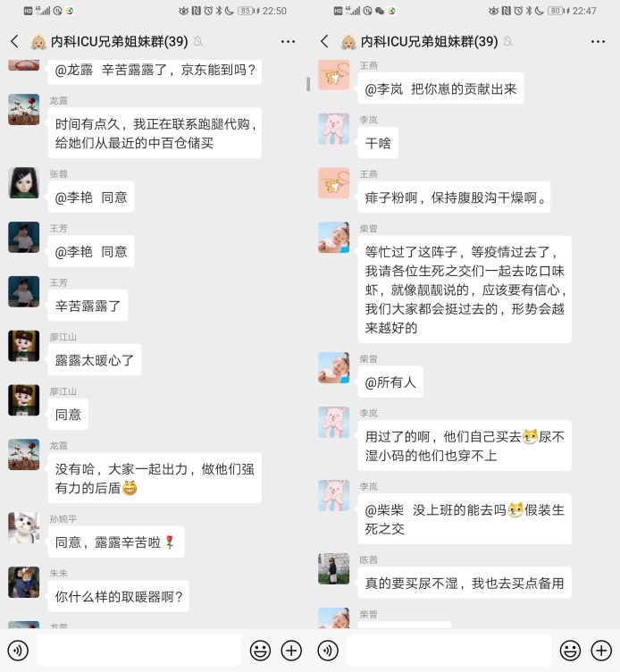 其实大家应该都知道我们内科ICU本来就是属于重症监护室,所以病人重,工作强度大,而且三年才能回家过一次年,因为我们这次的行动,科室已经取消了所有人员的休假,但是没有一个人有怨言,没有一个人有情绪,大家在劳累辛苦之余都是对我们满满的担心和牵挂。但是我知道,很多同事都是从年前一直默默的坚持到现在,因为人力紧张,大家不但没有休息,还要承担更多的压力。但是我的这群可亲可爱的同事们啊,大家信心满满,没有一丝懈怠,下班回家之余,还会不停的发信息过来问我们情况,问我们是否缺少什么,总是担心我们累着,饿着,休息不好,工作压力太大。可是,你们呢……?你们从来不向我们倾诉你们的辛苦,你们的疲惫。