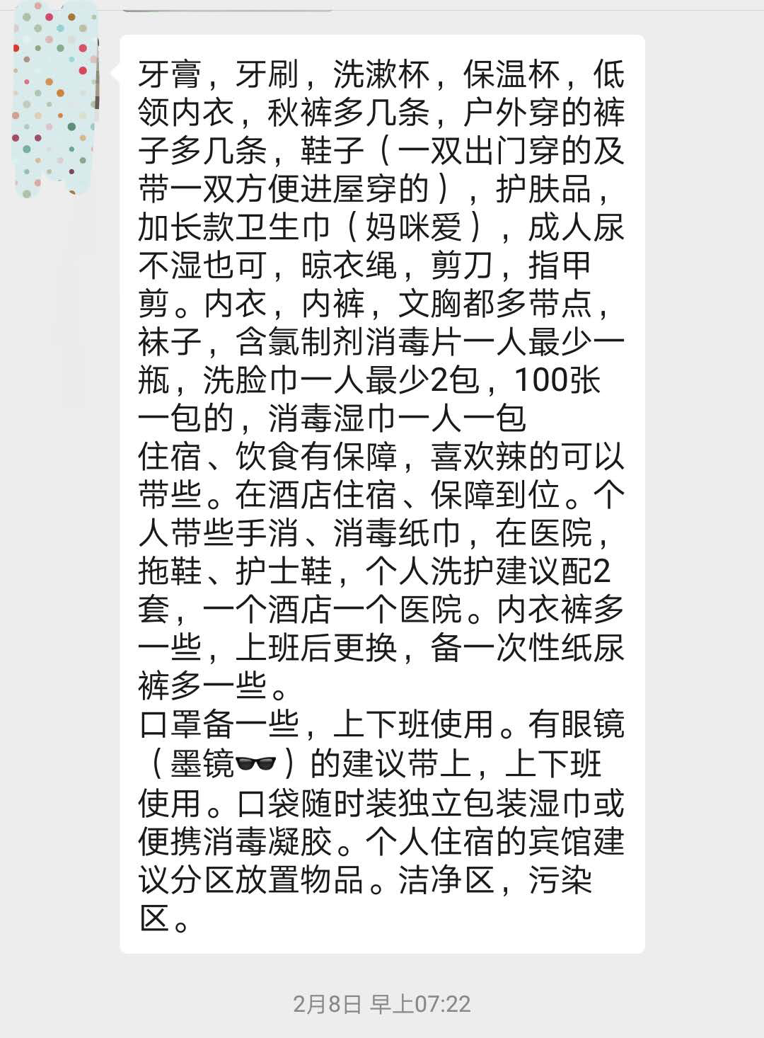 科里的姐妹们都知道危险。仓促之间,除了佩服,更是担忧。立刻,我们自发的筹备东西给你,我们没有上前线,但一定要做你坚强的后盾。这段时间,采购极为不便,只能是能带多少算多少。细心的刘芳列出清单,王月和刘恬一起一件一件拆开包装码进行李箱,为了省下空间。我们都怕你冷、怕你受伤、怕你离开家不会照顾自己……更重要的是,你说你的生理期快到了。