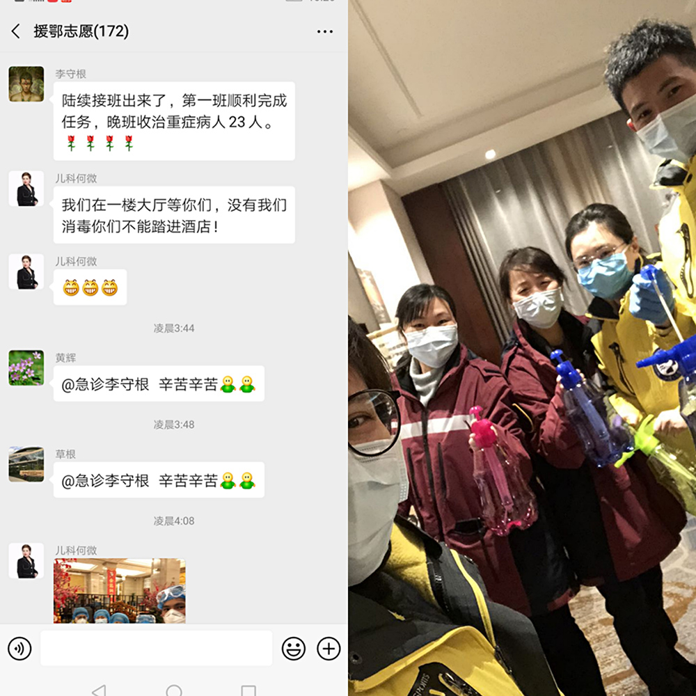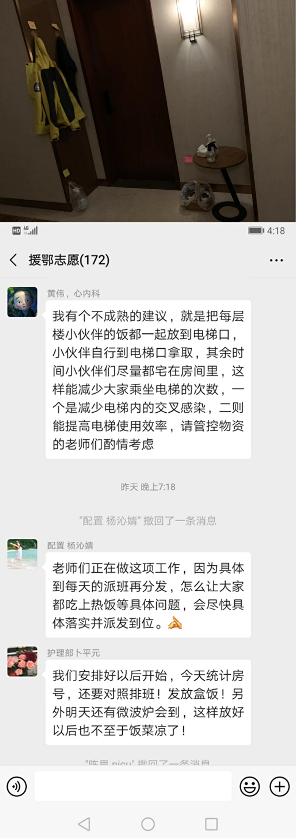 对“传染病”而言,“防护”就是生命,对“防护”而言,“细节”就是生命。年资高的老师总是身先士卒,所有年轻护士要走的路她们一定先走一遍,在实践中吸收经验再来指导我们。昨天下午,钟竹青老师带队,率先去医院踩点,忙到凌晨三点多才回酒店。晚班奋战在一线老师们完成了23位重症患者的收治。夜班又紧急收治了25位重症患者,以龙老师为首的“深夜杀毒五人组”熬了一个通宵,先是为我们设计房间活动分区,紧接着又在酒店门口为下班回来的伙伴们喷洒“84雨”,今天白天又组织不上班的老师注射胸腺肽,帮我们把每个房间外面的分区进行了标注,贴好衣物挂钩,为最大限度减少一线人员外出次数,还制订了新的取餐制度,每一处都特别细致,足见老师们的用心,疫情面前,奋战在一线的人是光荣的,默默在后方给予支持,提供后盾的人同样光荣。