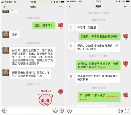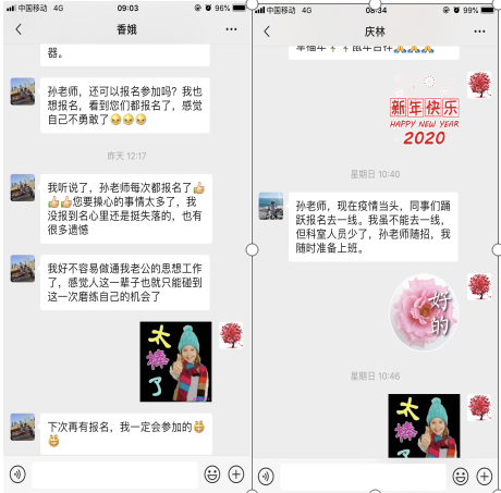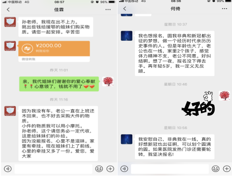 为应对可能的紧急驰援任务,护理部再次征集第二批援鄂备战培训队伍,我将此消息在护士群内一发出,马上就收到大量报名:有新护士徐金凤和甘港;有新婚蜜月期的刘婷……儿子不到两岁的刘恬对我说:“孙老师,我去过感染科,又在ICU待过,适合去前线,我报名”。虽然女儿不同意,但仍然坚持报名的苏志红说:“我是党员,我报名!”报名刚结束,有着两个年幼儿子的香娥还发信息对我说:“孙老师,还可以报名参加吗?我也想报名,看到每次您都报名了,您要操心的事情太多了,我没报到名心里还挺失落、挺遗憾的,我现在已经做通我家人的思想工作了,如果能再报名,我一定参加!”还有同样有着两个年幼儿子的佳霖给我转账两千元说:“孙老师,我现在出不上力,就转账给援鄂的姐妹们购买物质,请您一起安排,辛苦您。”当我表示不收钱后,她进一步深情地说:“因为我没有车,我只有小摩托,老公一直在上班还没回来,不方便去采购大件的物资。孙老师,这个请您务必一定代收,这是给姐妹们的补给。因为没能报名,心里不是滋味。现在姐妹们上了前线,心里的牵挂又多了一份。”正在休产假的崔庆玲表示:“孙老师,现在疫情当头,同事们踊跃报名去一线,我虽不能去一线,但科室人员少了,孙老师随招,我随时准备上班。”出夜班轮休的刘芳也表示:“孙老师,如果武汉前线还需要下一批,我报名,之前因为家里人工作没做好,所以没报,现在家里也支持,我也可以放心去前线贡献自己的一份小小力量了!”何倚也表示:“我也想报名,圆我非典和新冠都出征的梦想,做一个经历时代亲历历史事件的人,如果去不了,医院发热门诊还需要轮转,我也坚决报名!”