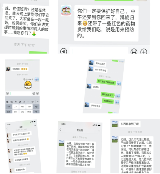 到了驻地后,左主任依然牵挂,信息和电话里满满都是关心。我知道主任向来繁忙,让她这么担忧我倍感愧疚。彭向东副主任也一再发信息给我,关心询问我们哪里有困难,缺什么,需要什么,他亲自去准备。李兵副主任也一直在说,家里有什么要做的随时说,大家会尽力帮你们解决。科室姐妹们也很牵挂我们,几个都说梦到我们平安归来了……