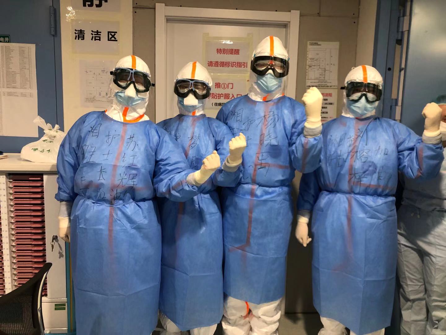 我还要向后方支撑工作的姐妹说一声:你们辛苦了。每天出入酒店给我们做清洁、消毒,三餐饭按时送到房间,及时通知和发放物资,保驾护航。感谢武汉市义工车队的师傅们,每日几轮往返,接送我们至医院和酒店间,辛苦了……
