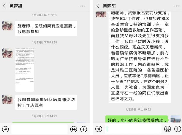 1月23日,除夕夜前一天,我的手机信息嘀嘀响了,你发来了一条消息:“护士长,武汉这次疫情形势严峻,医院控疫如果有需要,我愿意参加”。大年初二你又打来电话,看到全国多支医疗队驰援武汉,你着急地说:“我就在长沙,哪都没去,如果去武汉,我随时可以走。”当时我说:“你是家里独生女,又是新婚,还处于备孕状态,你得先跟你的先生和父母商量。” “他们懂我,早就知道我的心意,不要商量,他们都支持”。春节期间,你一边关注着武汉的疫情,一边通过各种方式向上级递交请战书。2月7日晚,医院召开紧急会议,组建国家医疗队次日驰援武汉,你第一时间得到了消息,立即再次向护士长、科室主任和护理部主任请战。你说你非常想去驰援武汉,你有多年危急重症科工作的经验,同时也是医院应急小组的成员,“我非常想尽自己的力量去帮助那些需要帮助的人。”得知科室有多人报名,你忐忑不安,一次次电话询问,很怕自己不被批准,名单公布看到自己的名字“黄梦甜”时,你兴奋得像个孩子,没有恐惧,没有害怕,也没有豪言壮语,只有即将奔赴前线的激情和斗志。这段时间,你数次电话数次短信数次请战,只为能去武汉抗疫战场,朴实的话语,坚定的信念,豪情的斗志,一次比一次强烈,这次请战过程是如此艰难,而又如此深情,终于,你达成所愿,成为了奔赴武汉的最美逆行者之一,我们真心为你骄傲。
