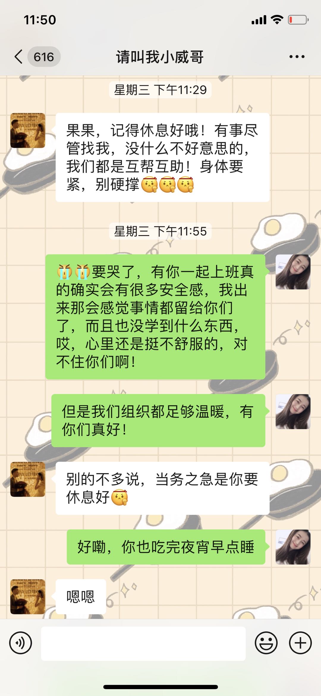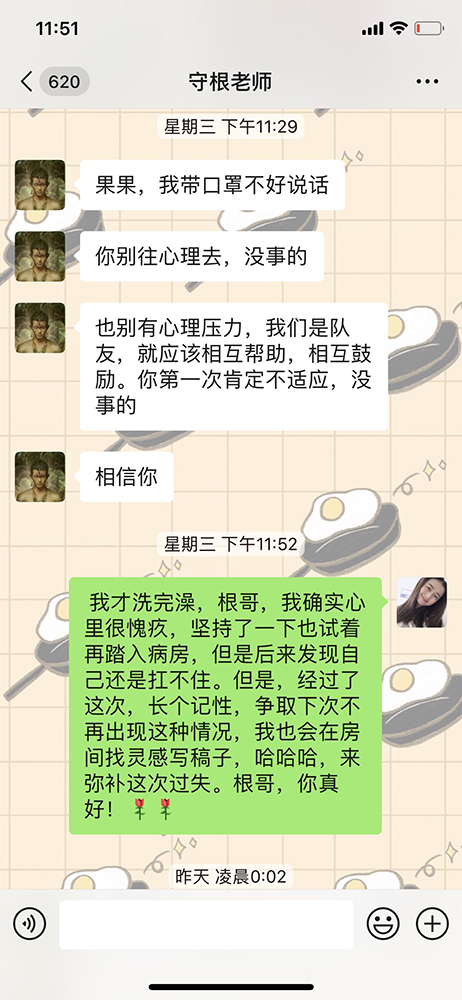 2月12日晚班,在守根老师的带领下,我们小组成员乘坐大巴车按时到达同济医院,在各位老师的相互帮助下,我穿好防护服进入病房。我和我的大学老朋友小威哥接管了较重的一组,刚开始一切都有条不紊地进行。随着时间的推移,穿上防护服的不适感在我身上开始出现,我试着放慢脚步做事,可即使这样,头昏心慌恶心想吐实在让人难受。小威哥招呼我坐着休息,我眼睁睁看着病房内忙碌的医生护士心里特别不是滋味,我再一次踏进病房,但过了一会儿发现自己还是不行。小组组长见状连忙打电话通知病房外面“守护”着我们的守根老师,他二话不说,穿好防护服进病房接替了我。出了病房脱下防护服的我,那些不适感缓解了,但我的心里特别难过,我真没用我很想哭。等到下班,看着同伴们两两一组从病房出来,他们里面穿的衣服无一例外全部被汗水浸透,这更加刺痛我的内心,我强忍泪水,我向我们组的队员表达歉意,但他们都笑着对我说“没关系”。