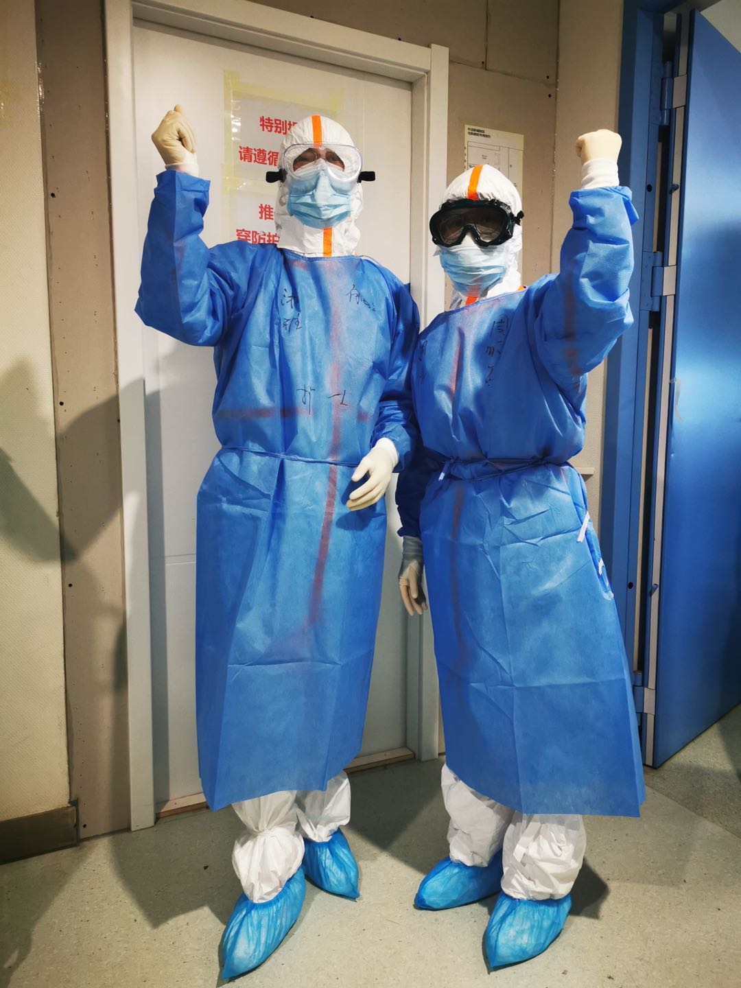 我和组长刘佳老师协助进入隔离病房的各位老师穿防护服、穿隔离衣、戴护目镜,把所有装备安装到位,严格检查把关,确保万无一失。然后在隔离衣上写上她们各自的名字,并为她们加油打气。最后,她们通过一道道关卡(缓冲区)进入到主战场——隔离病房开始她们的工作。在队员们进去之前,组长刘佳老师一再强调,有需要帮忙一定打电话出来,在清洁区等电话的同时,我和组长一起把更衣室整理干净并给予消毒处理。整理防护物资为下一班人员的进入做好准备。我做好随时进入主战场准备,在办公室听着她们与医生们通过电话有条不紊汇报病情,执行医嘱,回馈治疗和护理的结果……
