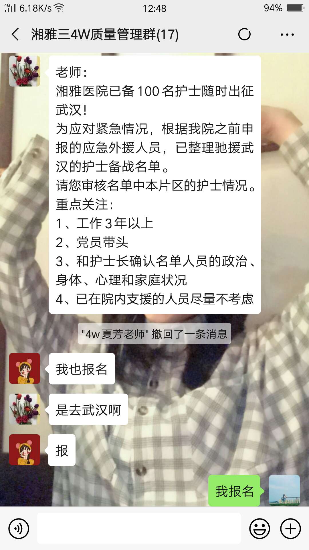 亲爱的水芳,自从武汉疫情爆发你就一直关注着各种信息。夏芳护士长在工作群一转发征集去支援武汉的志愿者的信息。你二话没说就报名了,夏芳老师说确定名单不要怕呀!你轻描淡写的说家里不需要你担心,冲!