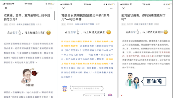 药学部结合群众需求,推出专业科普文章,指导选购消毒液,科学认识中药汤剂和免疫增强剂的作用,谨慎使用“神药”利巴韦林。截至2月19日,科普文章总阅读量达6.8万人次。