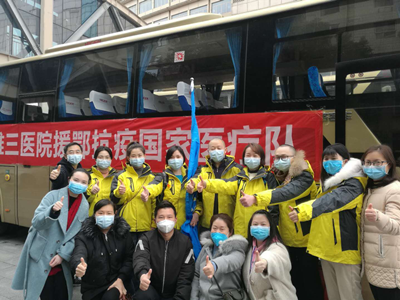 2月8日,医院130人援助湖北国家医疗队出征,呼吸内科刘纯、刘宗道、张强3名医生,朱素翠、赵艳、曾礼、龙果、向飞、杨晓禹6名护士第一时间报名。他们面对严峻的疫情形势,不顾安危、冲锋陷阵,在元宵佳节这个阖家团圆的日子,辞别亲人,逆行驰援武汉。