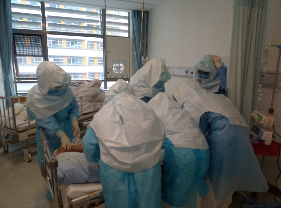31床黄大伯,是新冠肺炎合并重度ARDS患者,在镇静及有创呼吸机纯氧支持下,呼吸频率仍有三十多次,分钟通气量近20L/min,血氧饱和度仅94%左右,动脉血气二氧化碳分压78mmHg,肺通气及换气功能明显障碍,若不及时处理,患者肺将严重损失。危在旦夕,医疗团队当机立断,决定实施俯卧位通气。俯卧位是ICU重度ARDS患者的常规治疗操作,即使对于ECMO患者,大家也已经非常老练了。但当大家穿上连走路都得小心翼翼的防护服,戴上令人窒息、视物模糊的防护头罩时,如何在保证不暴露自己的基础上,将一个身形彪壮,体重近180斤,并且身上插着各种治疗管道的患者安全的完成俯卧位,这是团队协作和个人体能的双重挑战。气管插管及中心静脉置管是患者的生命管道,由呼吸治疗师李伟在头侧负责保护,刘纯主任及余晓护士长带着2名医生和1名护士一点一点的挪动病人,虽然缺氧导致大家动作迟缓,但也有条不紊,最终完美的完成俯卧位,此时大家头罩的面屏也早已布满雾珠。令人欣慰的是患者呼吸慢慢得到了改善,两个小时候后氧浓度已从纯氧下调到了65%。