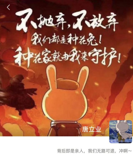唐立业的微信签名是“背后即是亲人,我们无路可退,冲啊~”配合《那年那兔那些事》动画里一只“种花家”的兔子头像,上面写着:“交给我来守护吧”。头像里,兔子露出令人踏实的后背,仿佛不管前方有多大的风浪,他都能顶住。