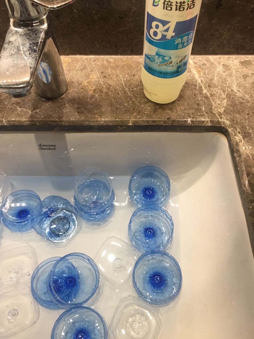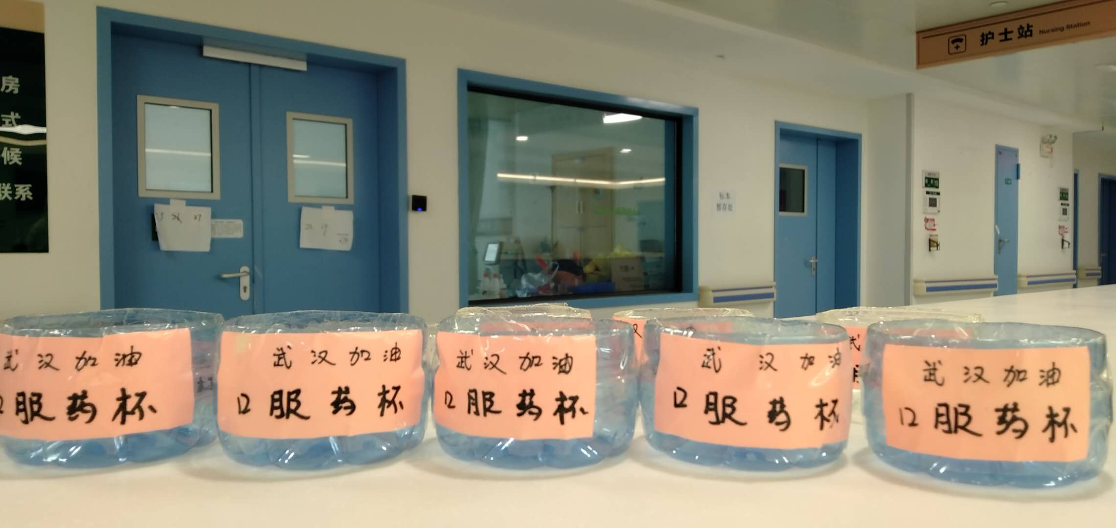 会议结束,大家赶紧去每一楼层收集矿泉水,将所有矿泉水瓶剪成小药杯的形状,用八四浸泡消毒并用清水冲洗干净后晾干,再贴好标识小纸条制作防割伤杯口,最后将药杯带到病房并分发给每一个病人,并一一向患者解释。希望他们能按时按量服用口服药,不多吃也不少吃任何一种口服药。患者们纷纷表示很能理解并会积极配合,也非常感恩得到了无微不至的照顾。