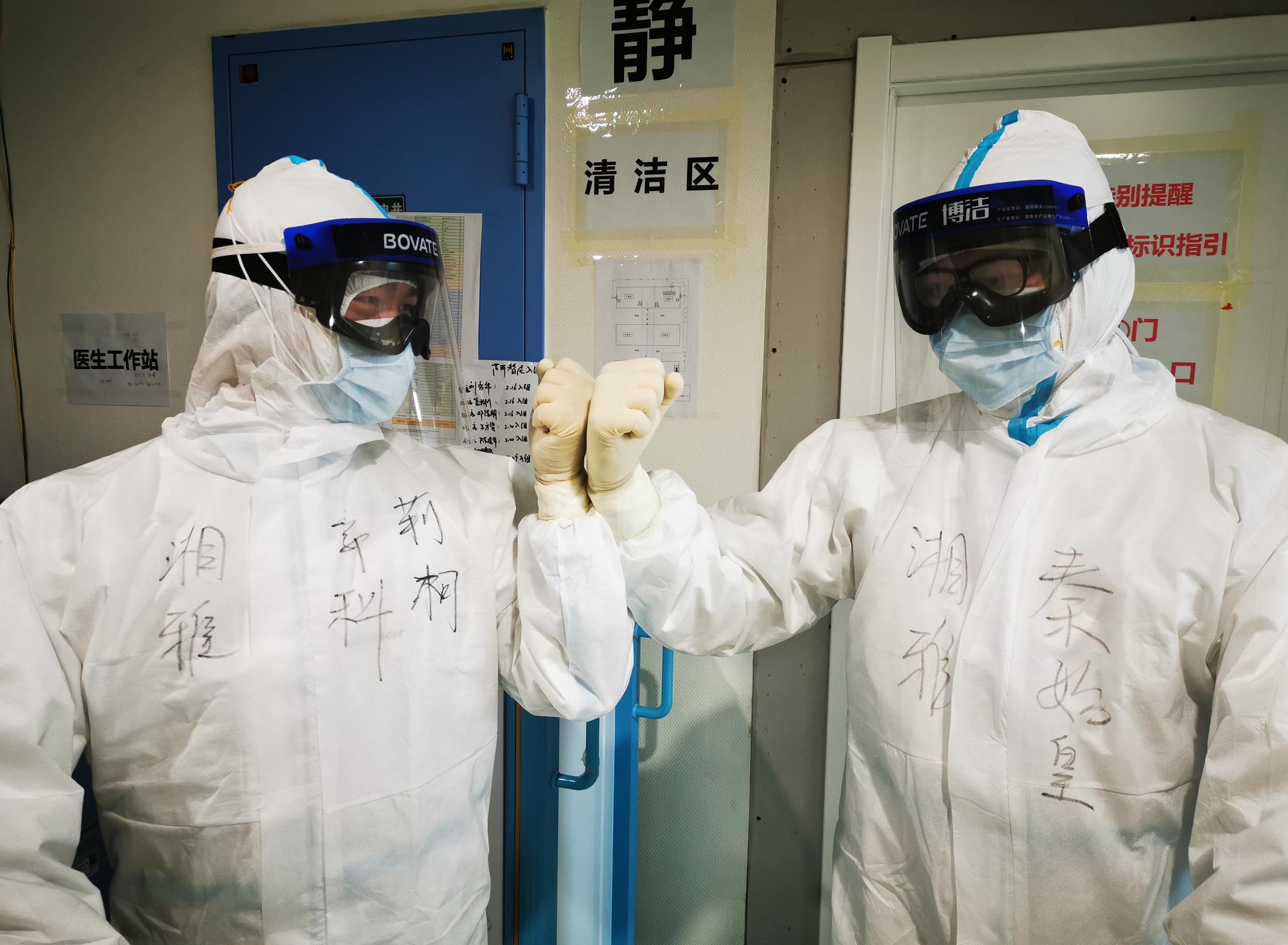 今天道组还有17名患者,4名患者计划出院,我们心情大好,也决定向护士们学习。穿好防护服后,神经内科的郭科非得要在我的防护服外面写上“陈冠希”作为标记,被我坚决反对。我可对这些明星没兴趣,决定取一个霸气的名字来震慑病毒,于是让他在我的防护服上写“秦始皇”三个字。郭科满脸的不服,决定压我一头,写个“荆轲”,而刘宗道老师拒绝了“刘邦”、“刘备”等标识,认为这样辈分比我低了,干脆让人写上“吕不韦”。