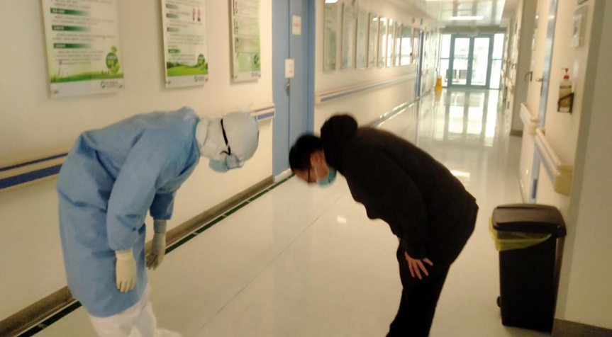 就这样近20天过去了,今天再次拿起护士站的广播播音时,突然听到有人亲切的喊我一声“根哥”,他说听到广播就知道是我。我当时还打趣说是不是自己是普通话不好,而且很啰嗦?只见他眼眶湿润了,哽咽说道:“我快要出院了,想和你合张影”。突然没来得及反应,他深深的向我鞠了一躬,我赶紧回鞠了一躬。我知道这一躬包涵了千言万语和无法言表的情怀,只因是疫情中彼此最相信的“家属”。
