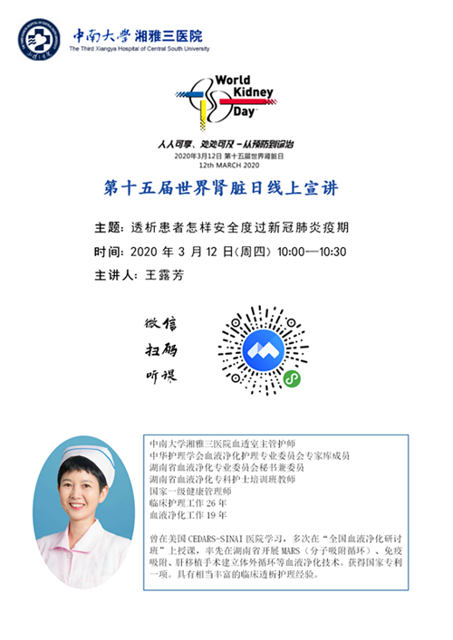 2020年伊始,一场突如其来的疫情正无情地席卷全球。虽然我国疫情目前出现向好趋势,但是防控任务依然严峻而复杂。3月12日是第15个世界肾脏病日,今年的主题是人人可享、处处可及——从预防到诊治,公平获得治疗。目的是提高社会对肾脏疾病的关注,共同维护肾脏健康。