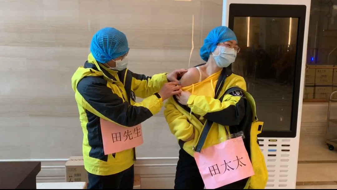 李妮从来没有那么迫切地希望上班,因为这个情人节他俩终于被安排一起进入隔离病房上晚班。在同事帮助下穿戴好防护用品,戴上三层手套后,田鹏伟牵着李妮的手,走过四道隔离门进入病房。虽然手套太厚,感受不到对方的温度,但李妮心里暖暖的。