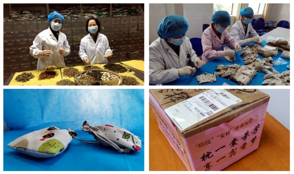 得知这些情况,中医科的医护们为前线的战友感到心疼不已。在科室主任和护士长的号召下,大家立刻行动起来制作“防疫安神”中药香囊。主任肖岚精心组方配伍,药剂科协助配药加工,中医科医护加班加点亲手制作香囊、装箱寄送……香囊的每一个细节都饱含着湘雅三医院医护人员对武汉逆行者们的敬意,香囊散发的每一缕芬芳都蕴涵着大家对驰援战士们的祝福。