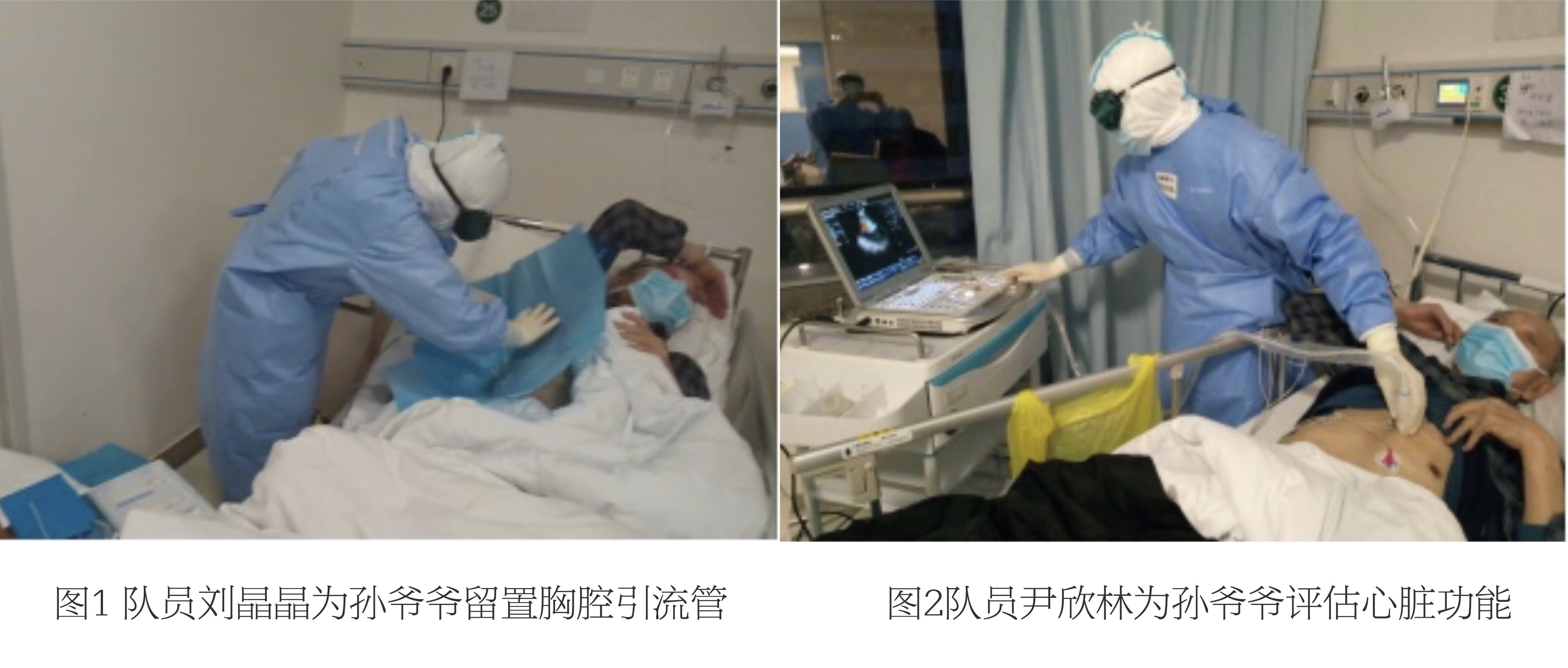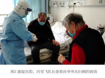 在张国刚院长、欧阳文副院长等专家、领导的指导下,重症一分队确定了护心、抗炎、抗病毒的治疗、支持方案,并针对血栓、胸腔积液等并发症进行了对症处理和精心护理。在入院后23天,孙爷爷的病情终于迎来转机,他自我感觉明显好转,要求下床活动。随后几天,孙爷爷的情况越来越好,肺部CT也明显好转。而他的老伴在刘纯教授为首的重症二分队的治疗下也基本康复。孙爷爷是医疗队负责的患者中年龄最大的,属于超高龄患者,病毒不但损伤了他的肺部,还明显攻击了他的心脏,导致病情反复,核酸试验迟迟不能转阴,给治疗带来很大的难度和不确定性。然而,在大后方专家、领导的支持下,重症一分队群策群力,在疫情消退之际,终于拿下这例高难度的病例。