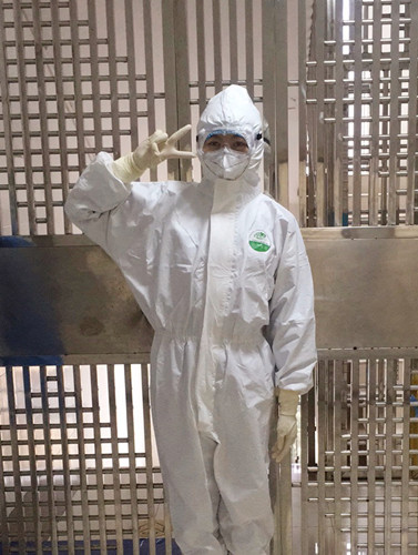 还记得我第一次穿上防护服,在各位老师的鼓励下走进隔离病房前,我很忐忑,很紧张!但是看到护士长拿起一只记号笔在我的防护服上写下:向婉婷,加油!其他老师拿着手机给我拍照留念,还不停地检查我的防护服是否穿到位,她们陪伴让我渐渐放下了心里的不安。到达病房后,跟上一班的老师做好交接,在熟悉工作流程以及病人情况后,我慢慢平复紧张的心情,暗暗给自己打气,一定要把病人的护理做到最好。我们病房收治的做咽拭子等待结果的疑似患者,每个患者都是单间隔离的,他们面对的是未知的恐惧和漫长的等待。所以护理工作中最重要的就是要细心耐烦做好宣教,讲解肺炎的治疗,疏导患者的心理,对于阳性和阴性患者做好出院终末消毒处置,还有出院居家患者的回访及健教,最重要的还有保护好自己不能因疏忽大意而被感染。