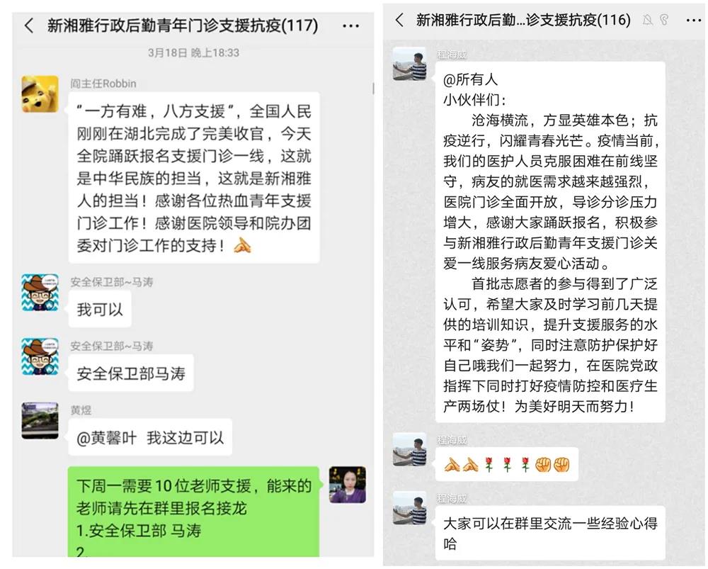 根据统筹推进疫情防控和恢复医疗工作运行需求,为加强门急诊预检分诊,确保医疗业务有序进行,在医院党委、行政领导下,湘雅三医院院办、团委、门诊部协同全院行政后勤管理部门联合组织了“新湘雅行政后勤青年支援门诊抗疫志愿服务活动”,以缓解临床一线工作压力,服务广大病友,更好地打赢疫情防控阻击战。百余名行政后勤青年纷纷踊跃报名,积极参与到抗疫行动中,争做新时代卫生健康事业的奋进者、开拓者、奉献者。