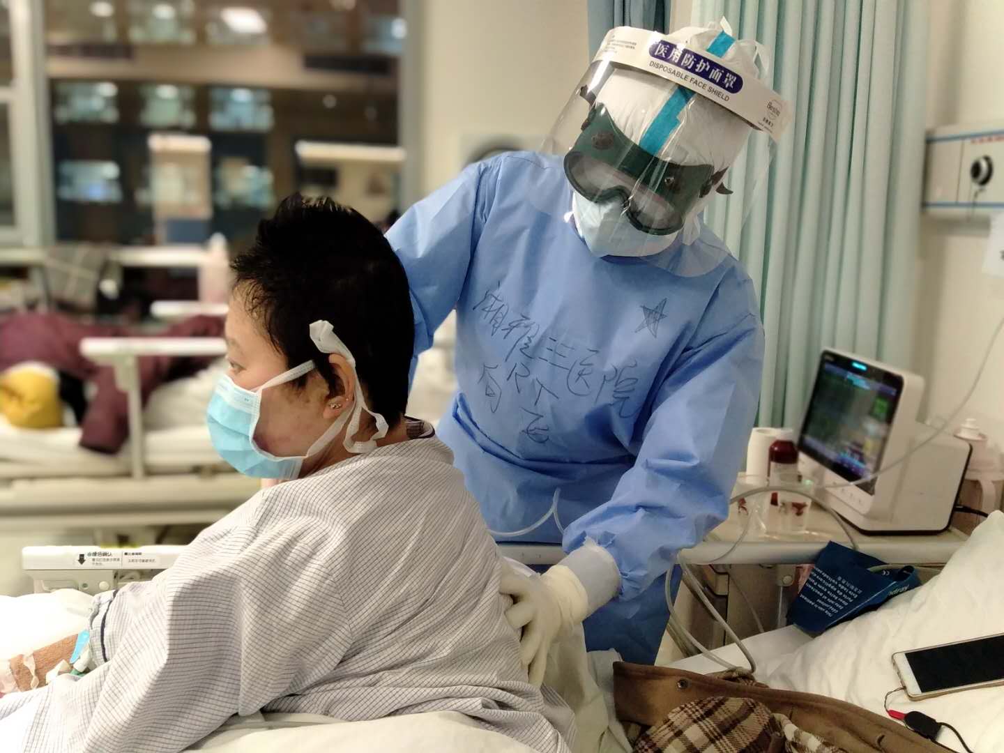经呼吸道飞沫和密切接触传播是新冠肺炎主要的传播途径。在相对封闭的环境中长时间暴露于高浓度气溶胶情况下,存在经气溶胶传播的可能。向飞作为湘雅三医院呼吸治疗师首当其冲,毫无畏惧。他与战友们一起把自己所学的呼吸治疗经验运用于中法院区重症监护室的患者:湿化氧疗、小剂量雾化、SBT(自主呼吸试验)、控制性氧疗、个性化呼吸参数调节、血气分析、气道护理等等……据他印象最深刻的是一位43床的叔叔,入院时面罩吸氧5L/min,血氧饱和度维持94%左右,由于病情进展迅速,第二天即发展为重度ARDS(成人呼吸窘迫综合征),氧饱和度85%,呼吸频率35次/min。作为呼吸治疗师的他毫不犹豫协助气管插管后行机械通气治疗,同时实施了俯卧位通气、肺复张等,最大限度地采取肺保护通气策略,连夜冒着风雪安全地将患者转入了ICU。他冻得手脚没感觉,防护服、护目镜外面沾上了厚厚的雪花,眼镜完全模糊了,衣服湿透了。他说:“这是病人性命之托,我们当竭尽全力!”