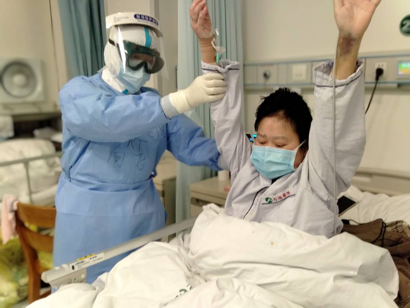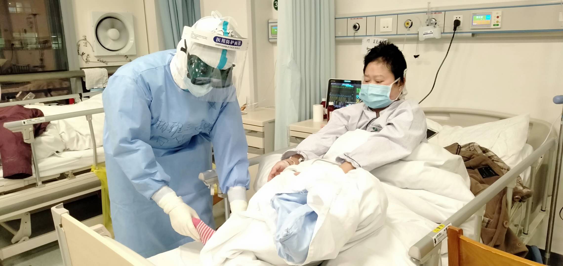对于新冠肺炎患者,早期的肺康复干预能很大程度改善其呼吸困难症状,减少并发症,缓解焦虑抑郁情绪,最大程度地恢复日常生活能力,提高生活质量。作为肺康复师的向飞,每天跟随医生查房,为每个患者制定个性化的肺康复计划。对于卧床患者,没有禁忌症者,尽早实施床上康复运动,如主动循环呼吸技术、腹式呼吸训练、缩唇呼吸训练、扩胸、抬腿、开腿、踝泵运动等系列运动。能下床的患者对其进行日常生活能力指导,主要是节能技术,将穿脱衣、如厕、洗澡等日常生活动作,分解成小节间歇进行,随着体力恢复再连贯完成,逐步恢复至正常。29床的病人,新入院时呼吸急促费力,患者不愿意进行任何活动,后来每天鼓励和指导患者进行呼吸训练,胸廓扩张,肌力训练,慢慢地患者气促症状得到明显改善,患者直夸自己从来没有见过这么有耐心又细心的男护士,感恩于他的耐心康复训练,让她恢复如此之快。还有个25床的爷爷,之前从未下过床,通过他的耐心肺康复指导,目前爷爷可以下床,并绕床边走动了,爷爷非常开心,见人就夸向护士真是人间英雄,比自己的亲人还要好。