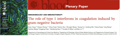 2020年4月2日,中南大学湘雅三医院血液内科吕奔教授团队在国际血液病学顶尖杂志《Blood》上,以领衔论文(Plenary Paper, 每期仅一篇)和封面报道的形式发表题为“The role of type 1 interferons in Gram-negative bacteria-induced coagulation” 的研究性论文。中南大学湘雅三医院博士杨新宇和博士研究生程晓烨为该论文并列第一作者,吕奔教授为论文通讯作者。