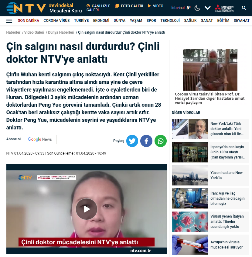 日前,应中国驻土耳其大使馆的邀请,中南大学湘雅三医院急危重症科副主任医师彭玥接受了土耳其收视率最高的新闻台NTV采访。