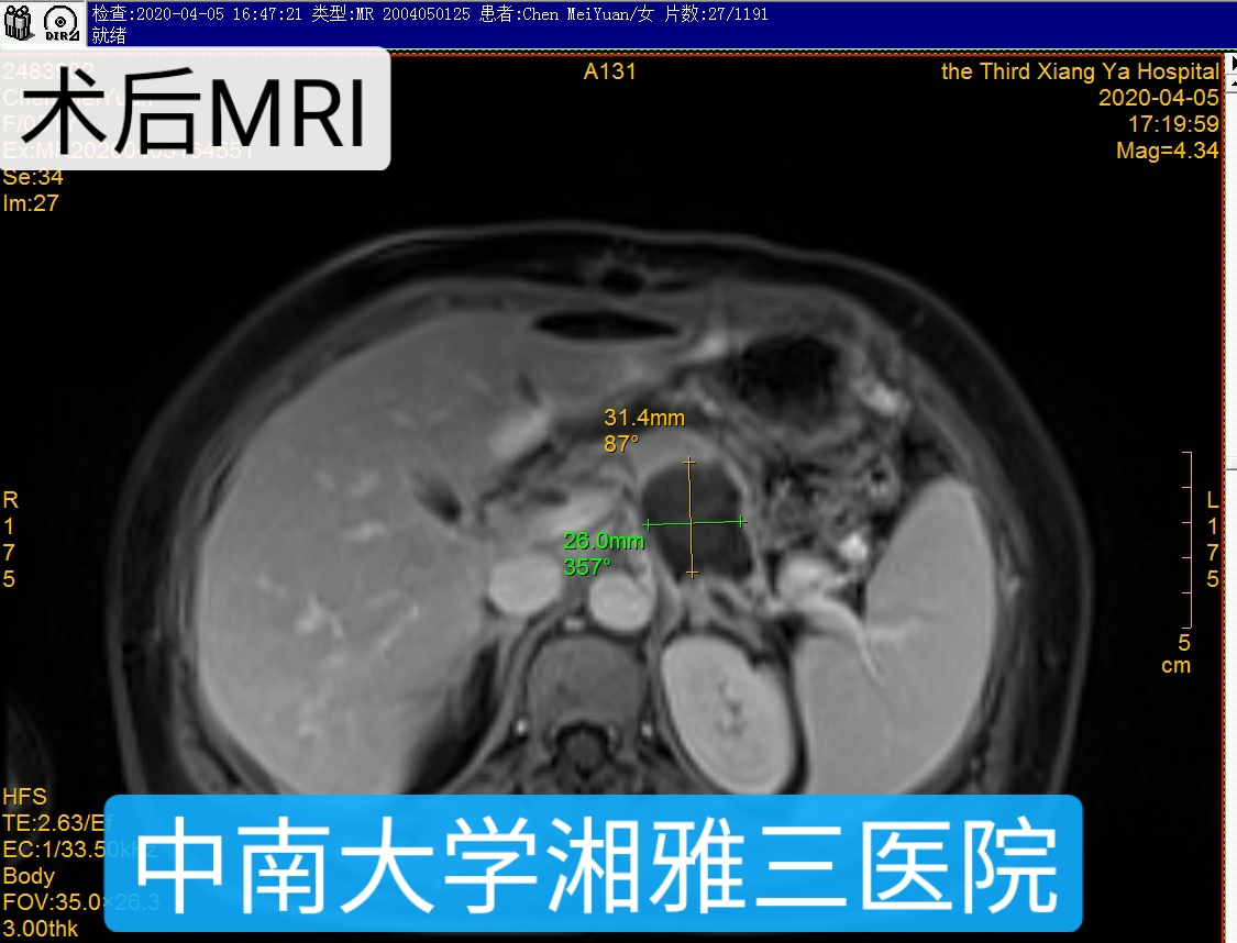 经过医院海扶治疗中心术前定位,评估可行性后,完善术前准备,于4月2日在镇静、镇痛麻醉方案下行胰腺肿瘤“海扶刀”治疗,术中辐照200秒,治疗总时间23分钟,患者术中无任何不适,生命体征平稳。术后超声造影提示:病灶内无血流灌注区,达到预期治疗效果。