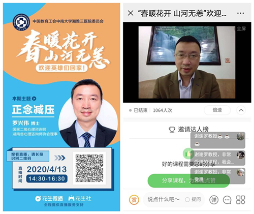 4月13日下午,湘雅三医院为援助湖北国家医疗队132名医疗队员在隔离期进行在线心理辅导。医院132名队员在武汉同济医院中法新城院区历经50个日夜连续奋战,圆满完成支援任务,他们在为挽救生命争分夺秒的同时,也承受着巨大的应激和工作压力。医疗队员的心身健康和生活状况,一直是牵动着社会各界。为做好医疗队心理健康服务,预防与减轻疫情所致的心理困顿,同时为返岗工作与家庭生活做好充分准备,湖南省医院协会职工心理健康专业委员会特邀中南大学湘雅二医院医学心理研究所罗兴伟博士为医疗队员进行了在线心理辅导。