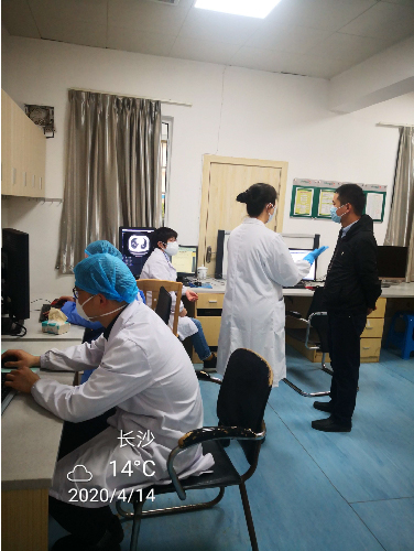 4月14日早晨六点,护理组与技术组检测人员全部到位。医院领导高度重视,副院长欧阳文亲自到放射科指导工作,慰问援鄂英雄。刘晟副主任和胡鹏志副主任坐镇指挥。援鄂医疗队员检查采用专用通道,分批由管控感染经验丰富的李小玲护士进行信息核对后,指引在专用区域候检,隔一个座位就坐。在机房检测时,实行一人三中单、两铅板全方位保护,并在检查间隙实施检查区域全面消毒,保证院感达标。技术员肖慈慧、何海波和唐春燕分工合作,实行一人扫描、一人摆位、一人进行后处理。诊断组由放射科有经验的质控员冯莉医生初筛,总住院向纪卉和赵晶医生写报告,由湖南省放射学会胸部学组委员刘煌辉带领其他诊断组成员进行报告审核。