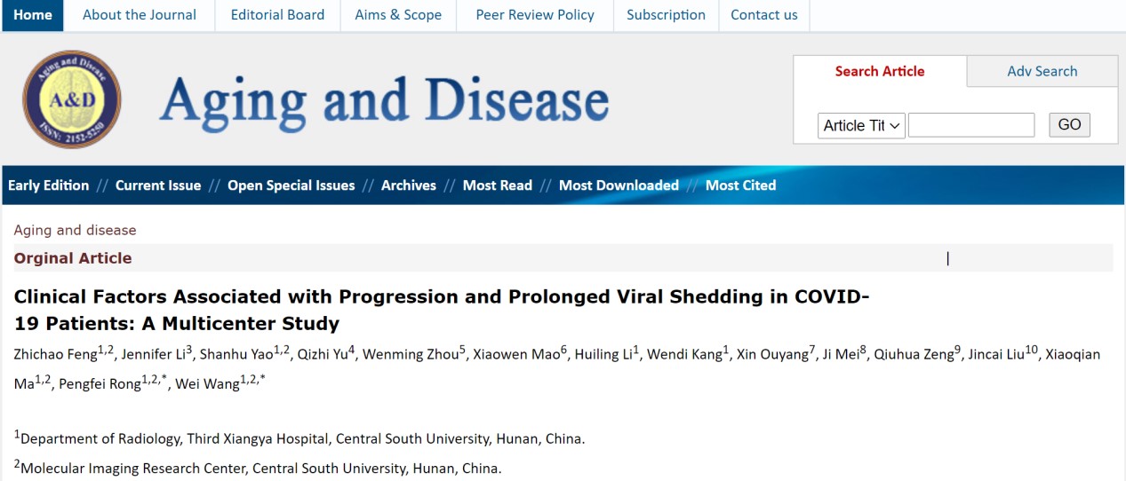 近日,中南大学湘雅三医院放射科王维、容鹏飞教授团队在老年医学领域排名第二(Q1)国际权威期刊《Aging and Disease》发表题为“Clinical Factors Associated with Progression and Prolonged Viral Shedding in COVID-19 Patients: A Multicenter Study”的研究论文。医院放射科17级在读博士生冯智超为第一作者,王维教授与容鹏飞教授为共同通讯作者,中南大学湘雅三医院为论文第一作者单位。