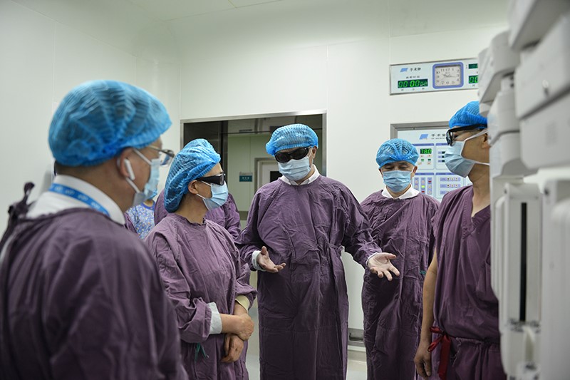 郑建新一行首先来到手术室,调研国产手术机器人研发使用情况。湘雅三医院医工结合特色突出,自主研发的“妙手”国产手术机器人逐步实现由简单到复杂、由单病种向多病种、由单学科到多学科的突破,目前已完成200余例高难度手术,并已完成临床应用安全性和有效性的前瞻性、多中心、随机、单盲、平行对照临床试验(RCT),使我国一跃成为极少数掌握该技术从装备研发到临床研究的国家之一。郑建新鼓励医院推动国产手术机器人临床应用和产业化进程,为健康中国贡献更大力量。