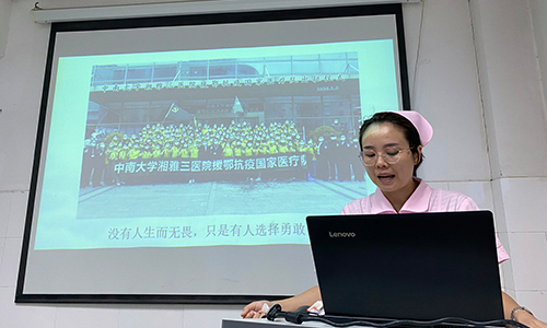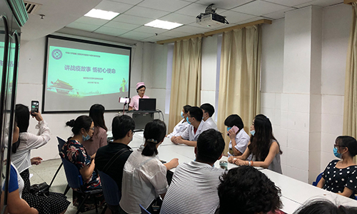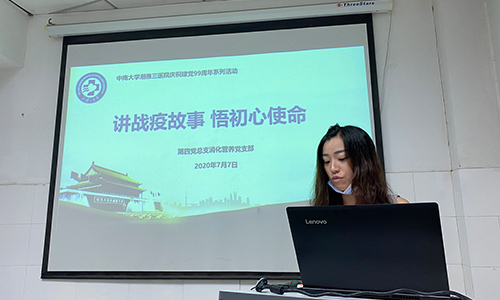 7月7日下午,中南大学湘雅三医院第四党总支消化营养科党支部积极响应党委号召,在内科楼6楼示教室顺利举办了“讲抗疫故事,悟初心使命”的主题党日活动。会议由第四党总支消化与营养科党支部副书记夏迎春主持,支部书记王晓艳教授致开场辞并进行会议总结。故事汇由消化内科援鄂护士黄丽丽、符敏依次演讲,与大家分享战疫五十余天的经历与感悟,党支部全体党员及科室部分医护人员参会。全程视频摄像,不落下大家的每一句发言,不错过两位战士的每一次感动,给大家上了一堂鲜活的党课。